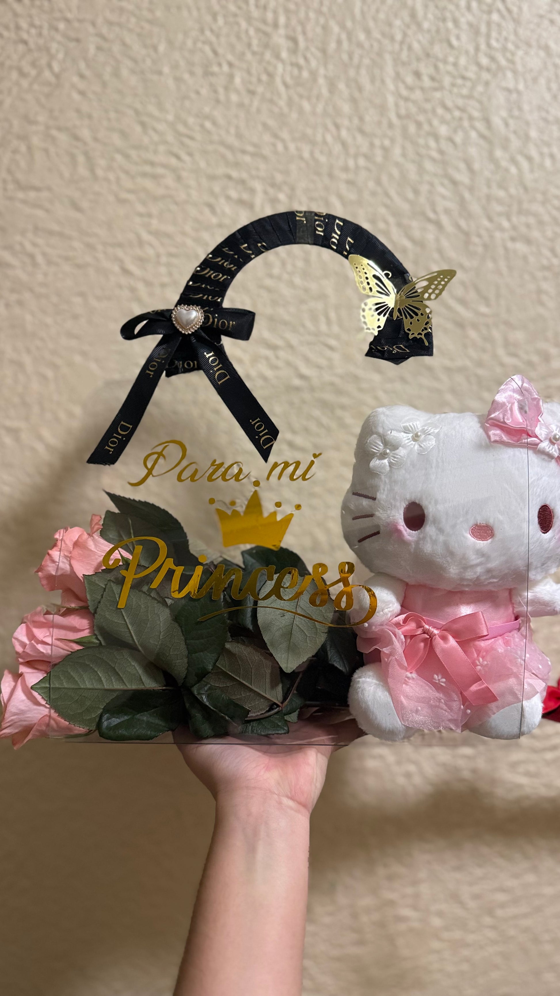 A delicate combination of natural pink roses, accompanied by a cute Hello Kitty-style plush toy, carefully presented in an elegant transparent bag with Dior ribbon details and a golden butterfly. A detail designed to celebrate with sweetness and sophistication.