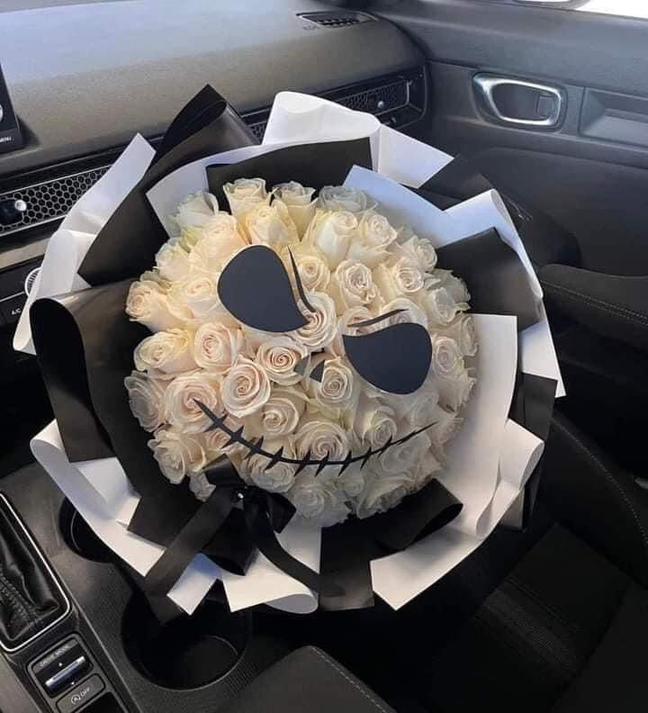 White roses shaped into Jack’s signature smile — a hauntingly elegant bouquet for the ones who believe love never dies 🖤