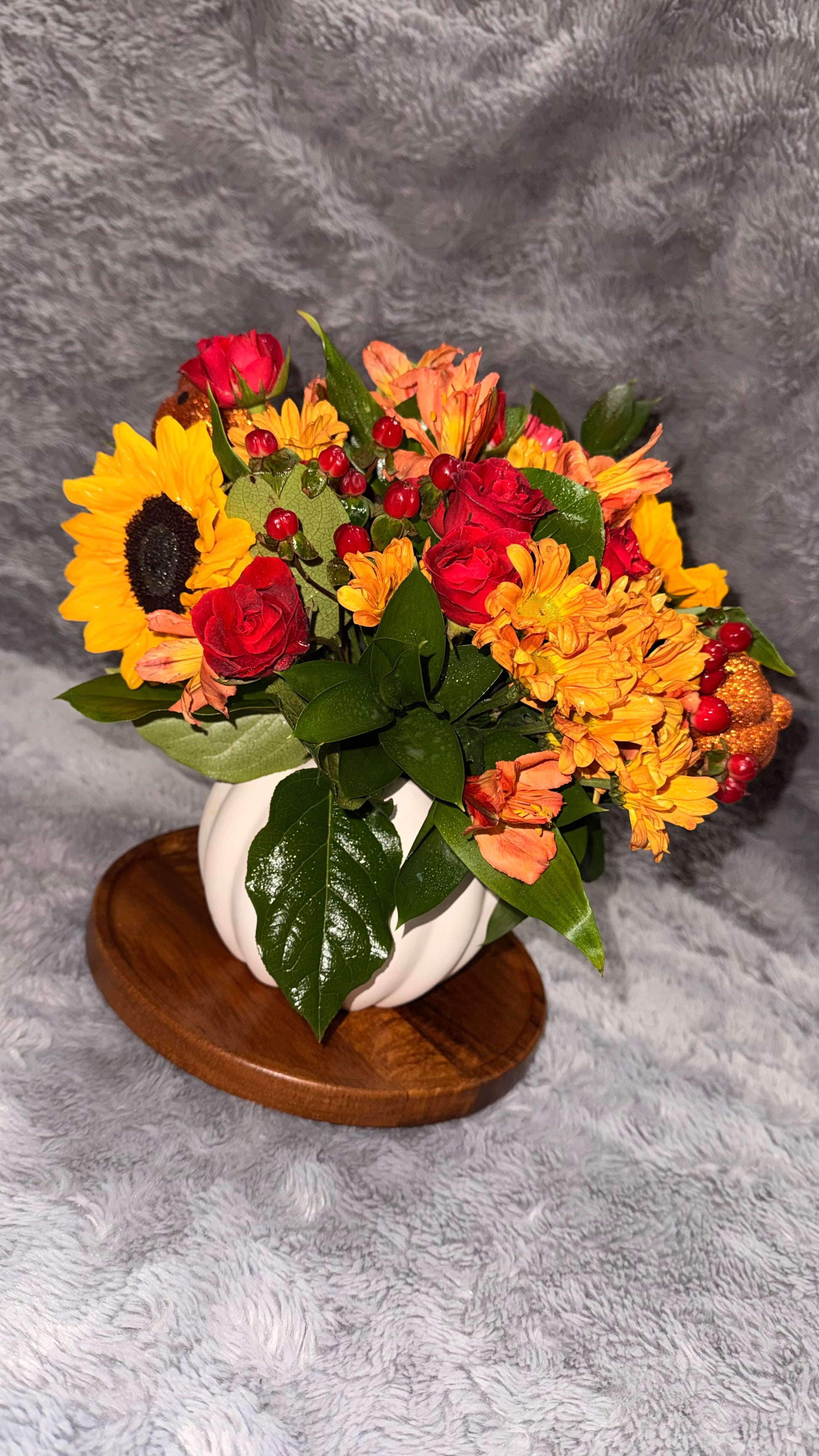 A charming and elegant design inspired by autumn. It combines warm flowers with a pumpkin-style vase, making it the perfect decorative piece. Beautiful for gifting or adorning your home.