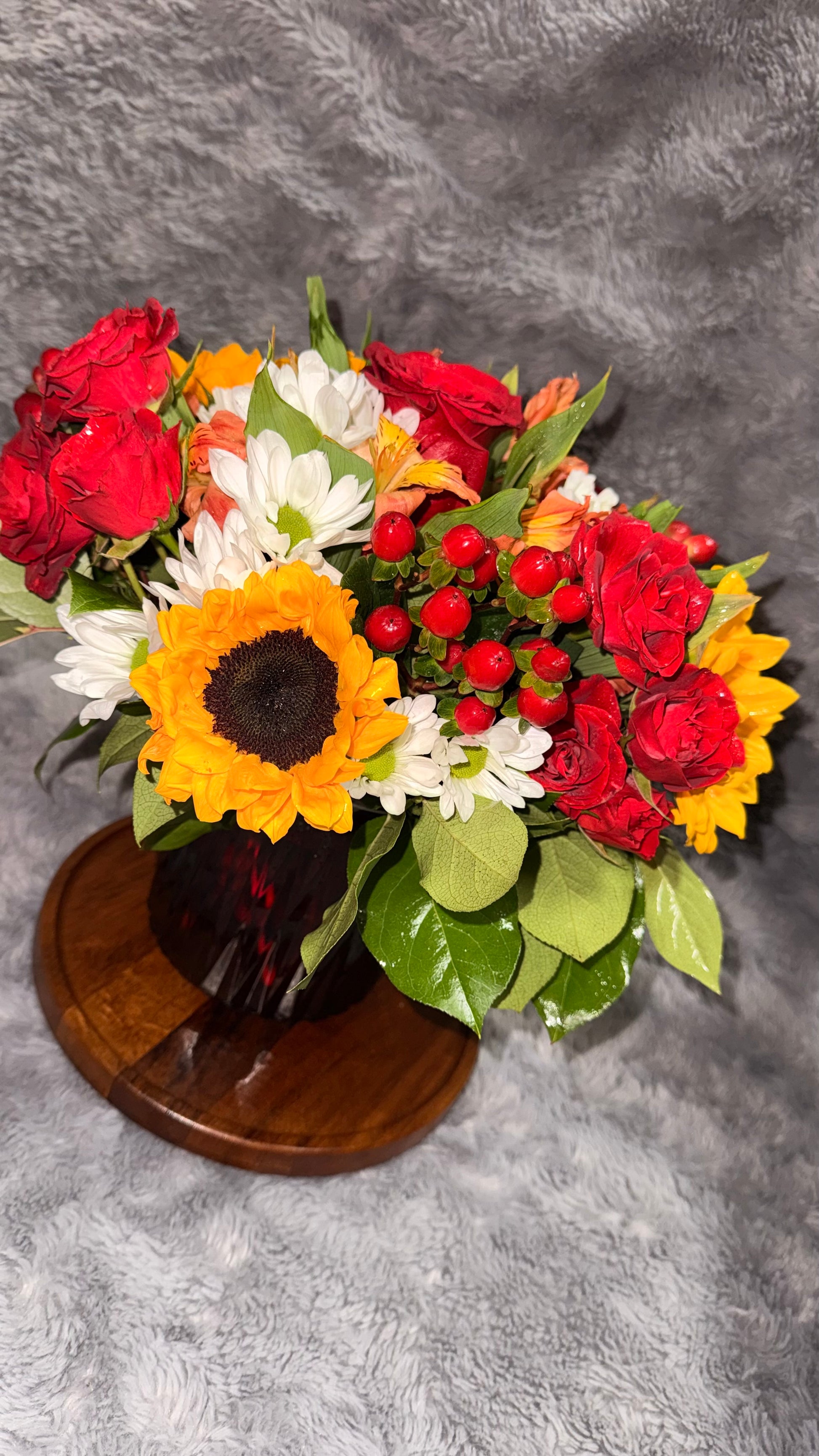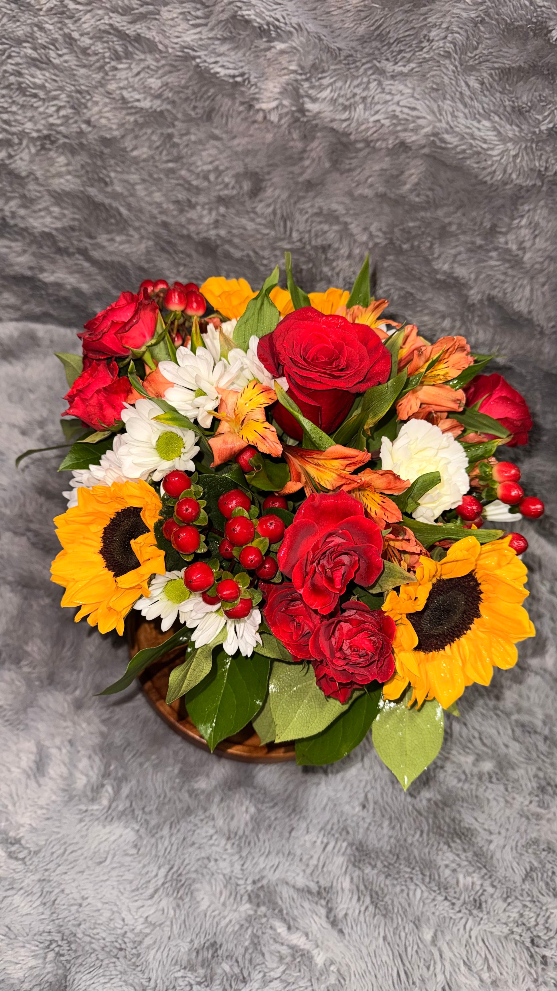 A vibrant arrangement of red roses, sunflowers, and autumnal touches that brightens any space. Perfect for a table, office, or as a special gift this season.