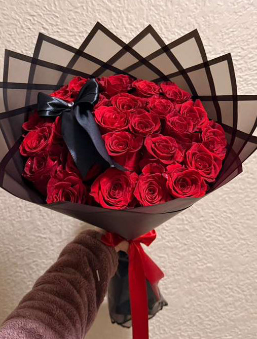 This exquisite bouquet captures the essence of true love with its rich, velvety red roses